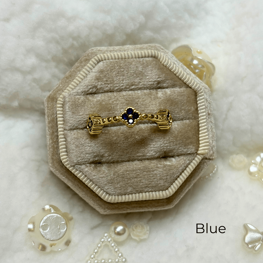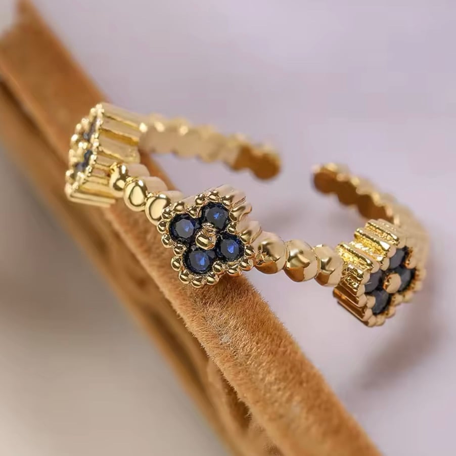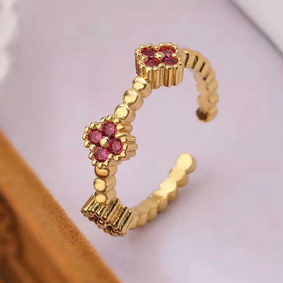 Add a playful pop of color and timeless charm with our Bloom Collection! These adjustable gold-tone rings feature a unique ribbed band with a dainty floral centerpiece, each accented with vibrant, sparkling stones in shades like magenta, emerald green, sapphire blue, and crystal clear.