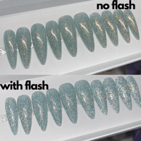 Hubble shown in long stiletto is a REFLECTIVE glitter/metallic light teal.